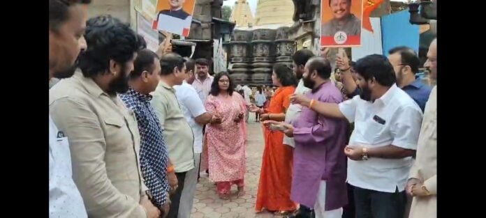 कोल्हापूर/प्रतिनिधी : कोल्हापुरातील श्री अंबाबाई तीर्थक्षेत्र विकास आराखड्यातील पहिल्या टप्यातील रु.१४३.९० कोटींच्या विकास कामांच्या आराखड्यास शासनाने आज प्रशासकीय मान्यता दिली याबद्दल शिवसेनेच्यावतीने श्री अंबाबाई मंदिर घाटी दरवाजा परिसरात भाविकांना वाद्याच्या गजरात साखरे पेढे वाटून आनंदोत्सव साजरा केला. याबाबत तमाम कोल्हापूर वासीय आणि आई अंबाबाई भक्तांच्या वतीने मुख्यमंत्री देवेंद्र फडणवीस, उपमुख्यमंत्री एकनाथ शिंदे, उपमुख्यमंत्री अजितदादा पवार आणि महायुती सरकारचे आभार शिवसेना जिल्हाप्रमुख सुजित चव्हाण यांनी मांडले.