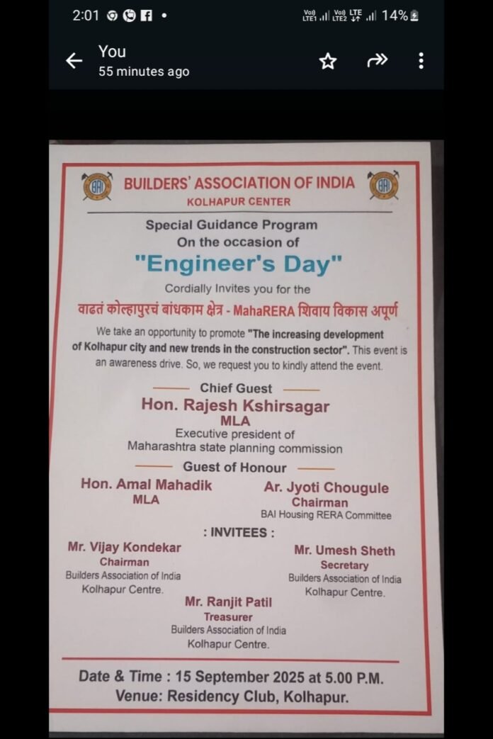 इंजिनीअर्स डे निमित्त बिल्डर्स असोसिएशन ऑफ इंडिया कोल्हापूर सेंटरच्या वतीने वाढतं कोल्हापूर बांधकाम क्षेत्र महारेरा शिवाय विकास अपूर्ण कार्यक्रमाचे आज आयोजन