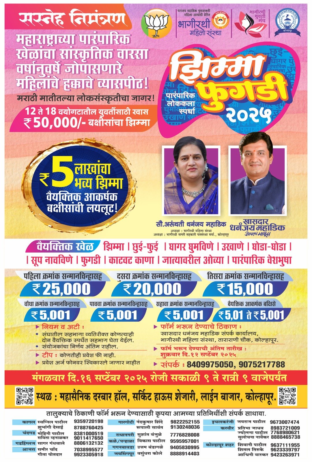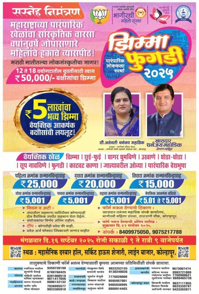 धनंजय महाडिक युवाशक्ती महिला आघाडी प्रेरित, भागीरथी महिला संस्था, गेल्या १२ वर्षापासून महिलांच्या कलागुणांना वाव देण्यासाठी, झिम्मा फुगडी स्पर्धेचे आयोजन करते. खासदार धनंजय महाडिक आणि भागीरथी महिला संस्थेच्या अध्यक्षा सौ. अरुंधती महाडिक यांच्या मार्गदर्शनाखाली ही स्पर्धा प्रचंड यशस्वी आणि लोकप्रिय बनली आहे. स्पर्धेला प्रत्येक वर्षी महिला भगिनींचा प्रतिसाद वाढत आहे. यावर्षीही होणार्या स्पर्धेत झिम्मा, घागर घुमविणे, उखाणे, सूप नाचविणे, काटवट काणा, छुई फुई, जात्यावरील ओव्या, फुगडी, घोडा घोडा आणि पारंपारिक वेशभूषा अशा गटांमध्ये ही स्पर्धा होत असून, या स्पर्धेसाठी पहिल्या क्रमांकाच्या संघाला २५ हजार रुपये आणि सन्मानचिन्ह, दुसर्या क्रमांकासाठी २० हजार रुपये आणि सन्मानचिन्ह, तिसर्या क्रमांकासाठी १५ हजार रुपये आणि सन्मानचिन्ह, तर चौथ्या, पाचव्या आणि सहाव्या क्रमांकासाठी ५ हजार एक रुपये आणि सन्मानचिन्ह तसंच ५०१ रुपयांपासून ५ हजार रुपयांपर्यंतची वैयक्तिक बक्षिसे दिली जाणार आहेत. स्पर्धेसाठी कोणतीही प्रवेश फी नाही. सहभागी सर्व महिलांसाठी चहा, नाष्टा आणि जेवणाची सोय करण्यात आली आहे. नेहमीच्या दिनचक्रात गुरफटलेल्या महिलांना विरंगुळा मिळावा, त्यांच्यातील सुप्त कलागुणांना वाव मिळावा आणि मराठी संस्कृतीचे जतन व्हावे, यादृष्टीने या स्पर्धेचे आयोजन करण्यात आले आहे. स्पर्धेतील खेळामुळे शरीराचा व्यायाम होण्याबरोबरच सांघिक भावना आणि आत्मविश्वासामध्ये वाढ होत असल्यामुळे, जास्तीत जास्त महिलांनी या स्पर्धेत सहभागी व्हावे, असा भागीरथी महिला संस्थेचा प्रयत्न असतो. त्याला जिल्हयातील शहरी आणि ग्रामीण भागातील हजारो महिलांचा उत्स्फुर्त प्रतिसाद मिळतो, असे सौ. अरूंधती महाडिक यांनी सांगितले. गेल्या १५ वर्षांत युवती आणि महिलांसाठी कळी उमलताना… हा प्रबोधनात्मक उपक्रम, मोफत शेळी वाटप, मोफत आरोग्य शिबिर, मोफत हेल्मेट वाटप, वृक्षारोपण, महिलांसाठी रोजगारपूरक मोफत प्रशिक्षण, बचत गटांना मोफत स्टॉल, मिस आणि मिसेस भागिरथी स्पर्धा, युवतींसाठी मोफत स्वसंरक्षण शिबिर, रक्तदान शिबिर, वाचनाची सवय वाढीला लागावी, यासाठी गावोगावी वाचनालय सुरू करणे असे उपक्रम राबवण्यात आले आहेत. हजारो महिला आणि युवतींना या उपक्रमाचा लाभ मिळाला आहे, असे सौ. महाडिक यांनी सांगितले. यावर्षी स्पर्धेचे फॉर्म भरण्याची सोय तालुकानिहाय प्रतिनिधींकडे आणि भागीरथीच्या ताराराणी चौकातील कार्यालयामध्ये उपलब्ध आहे. शुक्रवार १२ सप्टेंबर २०२५ ही फॉर्म भरून देण्याची अंतिम तारीख आहे. स्पर्धेसाठी सुमारे ४० परीक्षक, १५ निवेदिका आणि ६० स्वयंसेविकांची टीम सज्ज आहे. या स्पर्धेचा आनंद घरबसल्या लुटता