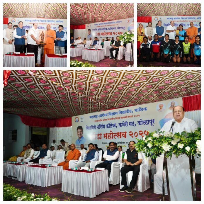 कणेरी (कोल्हापूर)/प्रतिनिधी : दोन दिवस चाललेल्या राज्यस्तरीय आंतर विभागीय निवड चाचणी क्रीडा स्पर्धा २०२५ चा समारोप समारंभ दिनांक ११ ऑक्टोबर २०२५ रोजी काडसिद्धेश्वर हायस्कूल,कणेरी येथे अत्यंत दिमाखात पार पडला.या समारोप समारंभास परमपूज्य श्री काडसिद्धेश्वर स्वामीजी, महाराष्ट्र राज्याचे वैद्यकीय शिक्षण मंत्री मा. श्री हसन मुश्रीफ तसेच प्राध्यापक डॉ. मिलिंद निकुंभ (प्र-कुलगुरू, महाराष्ट्र आरोग्य विज्ञान विद्यापीठ, नाशिक) उपस्थित होते.