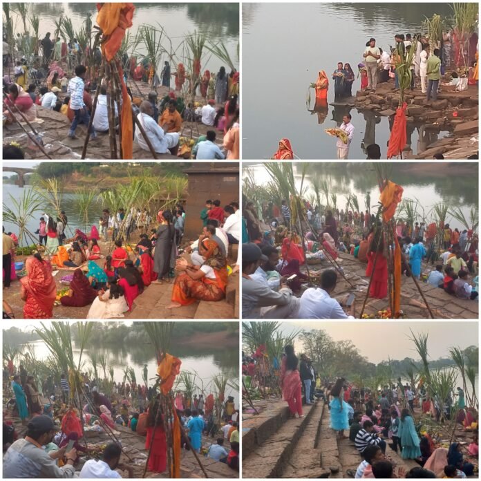 कोल्हापूर / प्रतिनिधी: कोल्हापुरातील उत्तर भारतीय नागरिकाकडून पंचगंगा घाटावर पवित्र छट पूजा करण्यात आली.आज रविवारी १९ नोव्हेंबर रोजी दुपारी ४.३० वाजता पंचगंगा घाटावर उत्तर भारतीयांच्या मध्ये पवित्र मानल्या जाणाऱ्या छटपूजेला सुरुवात झाली आहे . मावळत्या सूर्याची पूजा करण्यात आली. अखिल भारतीय क्षत्रिय महासभा, दिल्लीचे महाराष्ट्राचे महामंत्री अजय राम सिंह आणि कोल्हापूर जिल्हाचे महामंत्री उपदेश सिंह यावेळी उपस्थित होते.